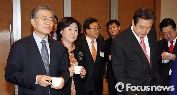 (서울=포커스뉴스) 중장기 어젠다 추진 전략회의가 26일 대한상공회의소 국제회의장에서 열린 가운데 회의전 3당 대표와 기업인들이 티타임을 갖고 있다.