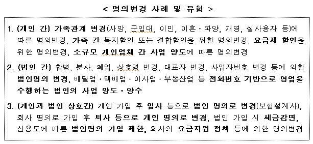 우선 미래부는 번호 매매를 명의변경을 원칙적으로 제한한다.다만 명의변경 제한으로 선의의 피해자가 발생하지 않토록 가족 간 명의변경, 법인 상호 간 , 회사 입퇴사로 인한 직장 변동, 기타 사업의 연속성이 확인되는 경우 등 부득이한 경우에는 예외적으로 허용하기로 했다.또 최근 3개월 간 연속해서 통화량이 없는 경우에는 명의변경을 허가하지 않고, 개인에서 법인으로 또는 법인에서 개인으로의 명의 변경은 허용횟수를 3개월에 1회로 제한하도록 했다.