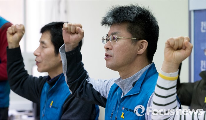 (서울=포커스뉴스) 26일 오전 서울 서대문구 전국교직원노동조합 대회의실에서 변성호(오른쪽) 전교조 위원장이 법외노조통보 항소심 판결과 교육부 후속조치에 대한 전교조 입장 발표 기자회견에 참석해 구호를 외치고 있다.