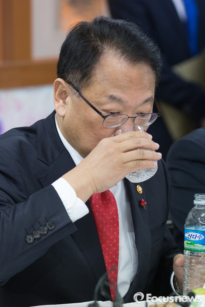(서울=포커스뉴스) 유일호 경제부총리 겸 기획재정부 장관이 26일 오전 서울 강서구 보라유치원에 방문해 유치원 관계자 및 학부모들과 간담회 전 목을 축이고 있다.