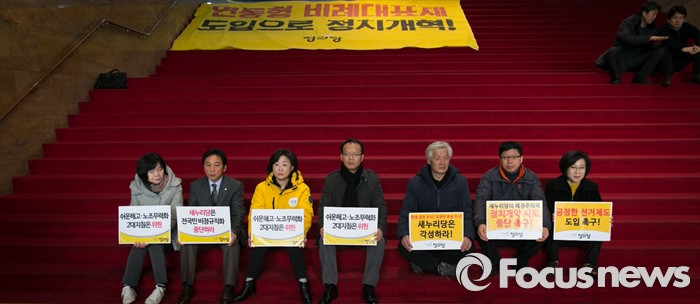 (서울=포커스뉴스) 26일 오전 서울 여의도 국회 본청 로텐더홀에서 심상정(왼쪽 세번째) 정의당 상임대표를 비롯한 의원 및 당직자들이 노동법 및 선거법 개악시도 중단 결의대회를 마친 뒤 농성을 이어가고 있다.