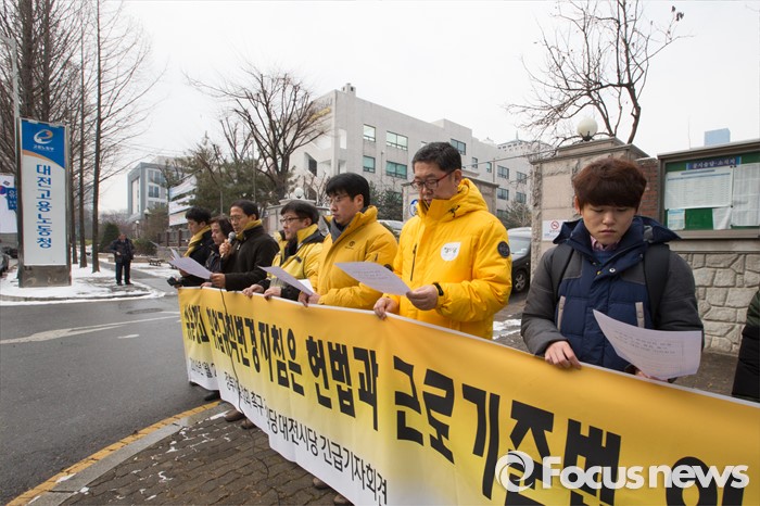 (대전=포커스뉴스) 26일 오전 대전 서구 대전지방고용노동청 앞에서 정의당 대전시당원들이 기자회견을 열고 쉬운해고 취업규칙 변경 및 정부지침 철회를 촉구하고 있다.