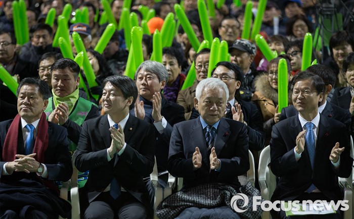 (전주=포커스뉴스) 국민의당 안철수 의원과 국민의당과 통합을 선언한 천정배 의원이 26일 오전 전주시 완산구 화산체육관에서 열린 전북도당 창당대회에 참석하고 있다. 왼쪽부터) 안철수, 김한길, 천정배 의원.