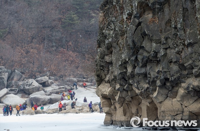 (철원=포커스뉴스) 26일 오전 강원 철원군 한탄강 일대에서 여행객들이 얼음트래킹을 즐기고 있다.