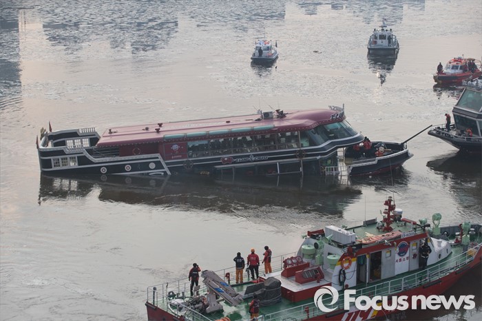 (서울=포커스뉴스) 26일 오후 서울 한강 영동대교 아래에서 한강유람선이 침수돼 구조대원들이 구조활동과 견인 작업을 하고 있다.