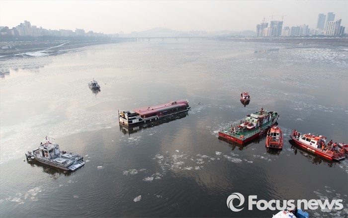 (서울=포커스뉴스) 26일 오후 서울 한강 영동대교 아래에서 한강유람선이 침수되고 있다.