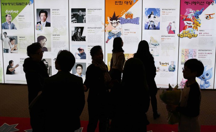 이번 통계조사는 문체부가 9개 산업(출판·만화·음악·게임·애니메이션·광고·캐릭터·지식정보·콘텐츠솔루션)의 사업체를 대상으로 조사한 결과와 2개 기관(영화진흥위원회·방송통신위원회)에서 실시한 영화, 방송 산업의 조사결과를 인용해 집계한 것이다.지난해 12월8일 서울 삼성동 코엑스 콘퍼런스룸에서 열린 '2015 대한민국 콘텐츠 대상' 시상식에 참석한 사람들이 수상자 및 수상 작품을 관람하고 있다.<사진제공=문화체육관광부>