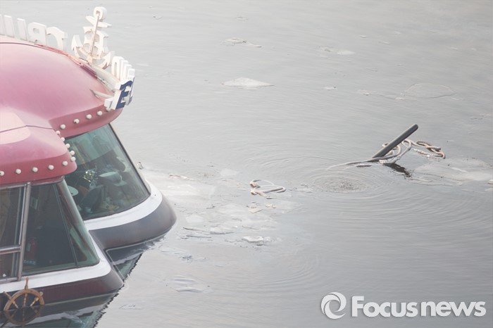 (서울=포커스뉴스) 26일 오후 서울 한강 영동대교 아래에서 한강유람선이 침수되고 있다.