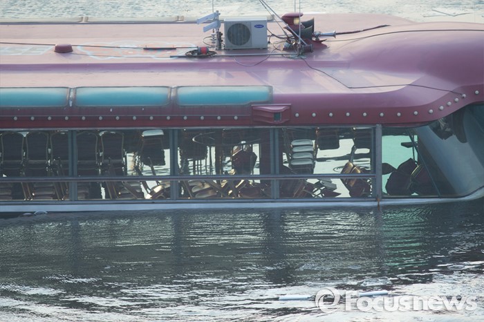 (서울=포커스뉴스) 26일 오후 서울 한강 영동대교 아래에서 침수된 한강유람선 안으로 물이 들어차고 있다.