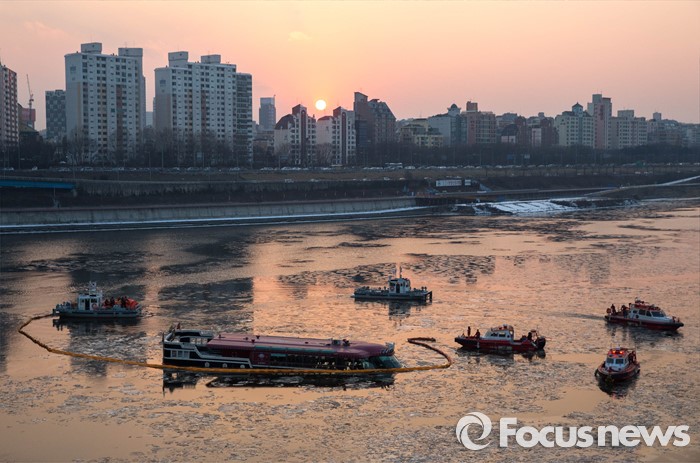 (서울=포커스뉴스) 26일 오후 서울 한강 영동대교 아래에서 한강유람선이 침수되어 관계 당국이 기름 유출을 막기 위해 방재작업을 하고 있다.