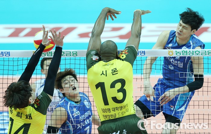 (안산=포커스뉴스) 26일 안산상록수체육관에서 열린 '2015-2016NH농협 V-리그' 남자부 OK저축은행-삼성화재 경기에서 OK저축은행 송희채가 삼성화재 이선규의 속공을 블로킹으로 차단하고 있다.
