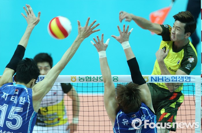 (안산=포커스뉴스) 26일 안산상록수체육관에서 열린 '2015-2016NH농협 V-리그' 남자부 OK저축은행-삼성화재 경기에서 OK저축은행 송명근이 삼성화재 지태환, 유광우의 블로킹을 향해 스파이크를 때리고 있다.