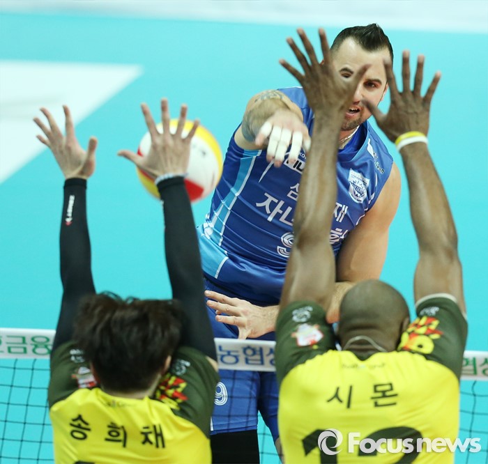 (안산=포커스뉴스) 26일 안산상록수체육관에서 열린 '2015-2016NH농협 V-리그' 남자부 OK저축은행-삼성화재 경기에서 삼성화재 그로저의 스파이크를 OK저축은행 송희채와 시몬이 블로킹으로 차단하고 있다.