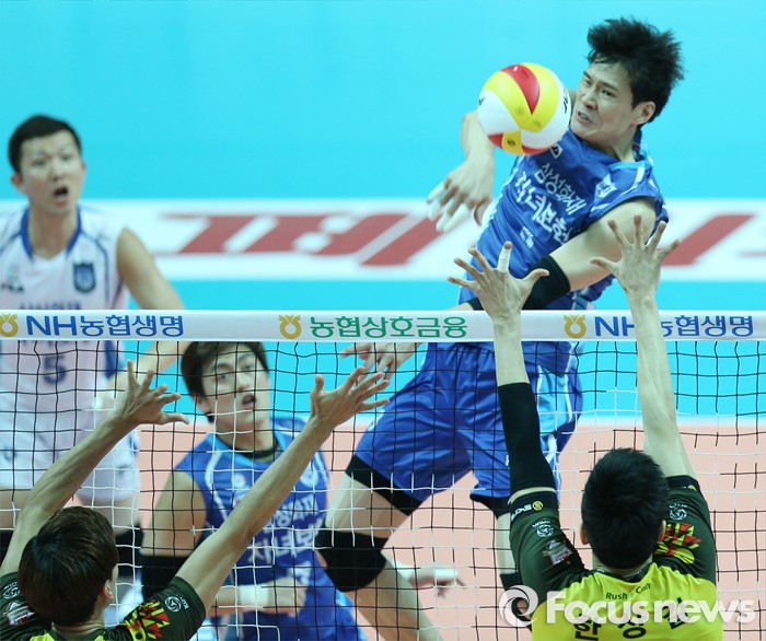 (안산=포커스뉴스) 26일 안산상록수체육관에서 열린 '2015-2016NH농협 V-리그' 남자부 OK저축은행-삼성화재 경기에서 삼성화재 최귀엽이 OK저축은행 이민규의 블로킹을 피해 스파이크를 때리고 있다.