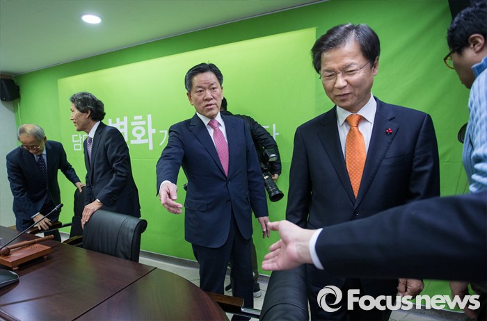 (서울=포커스뉴스) 국민의당 주승용 원내대표가 27일 오전 서울 마포구 국민의당 당사에서 열린 기획조정회의에서 천정배 의원에게 자리를 양보하고 있다.