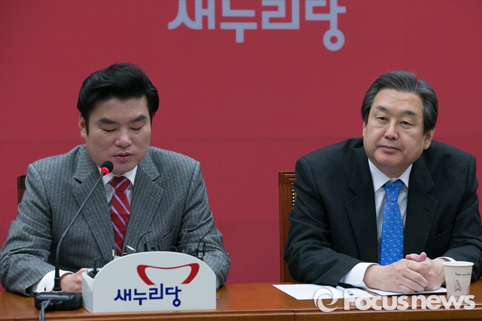 (서울=포커스뉴스) 원유철(왼쪽) 새누리당 원내대표가 27일 오전 서울 여의도 국회에서 열린 최고중진연석회의에 참석해 모두발언하는 동안 김무성 대표가 경청하고 있다.