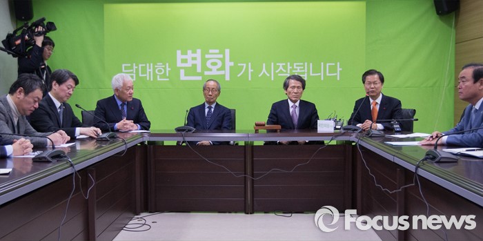 (서울=포커스뉴스) 국민의당과 통합한 천정배 의원이 27일 오전 서울 마포구 국민의당 당사에서 열린 기획조정회의에 참석하고 있다. (왼쪽 두번째부터) 안철수 의원, 김한길 의원, 윤여준 공동창준위원장, 한상진 공동창준위원장, 천정배 의원