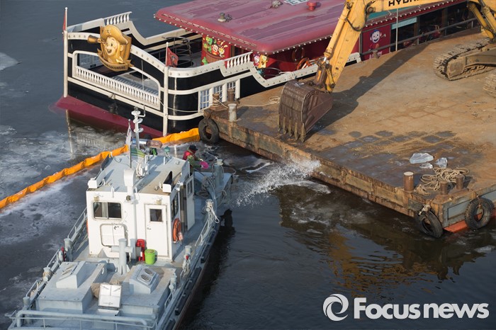 (서울=포커스뉴스) 27일 오전 서울 한강 영동대교 아래에서 침수된 한강유람선을 인양하기 위해 바지선을 정박, 관계 당국이 얼음을 녹이는 작업을 위해 염화칼슘을 살포하고 있다.