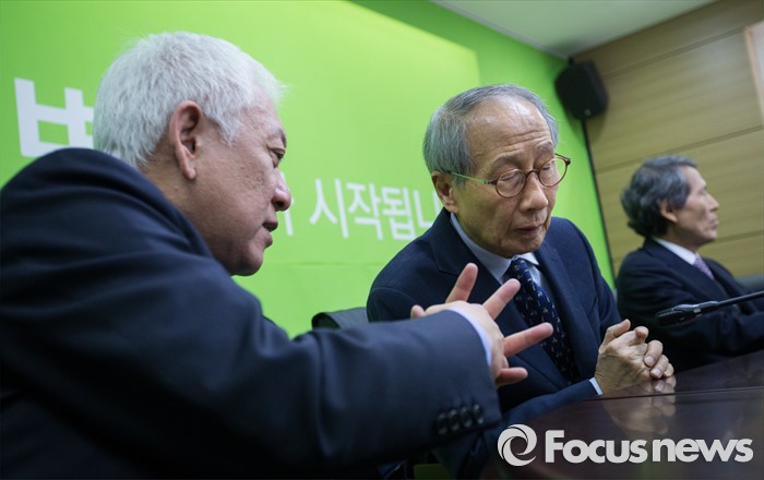 (서울=포커스뉴스) 국민의당 김한길 27일 오전 서울 마포구 국민의당 당사에서 열린 기획조정회의에서 윤여준 공동창준위원장에게 귀엣말을 하고 있다.