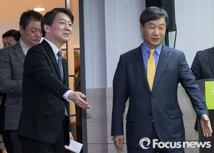 (서울=포커스뉴스) 국민의당 안철수 의원이 27일 오전 서울 마포구 국민의당 당사에서 국민의당 언론특보로 선임 된 한명규 코라오 그룹 부회장을 기자회견장으로 안내하고 있다.