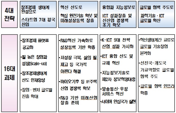 미래부는 창조경제를 통한 성장동력 창출을 가속화하기 위해 △스타트업 7대 강국 진입 △핵심 원천기술 확보 및 미래성장동력 창출 △ICT(정보통신기술) 성과창출 및 신산업 경쟁력 조기 확보 △과학기술·ICT 글로벌 확산 등 4대 전략을 도출했다.