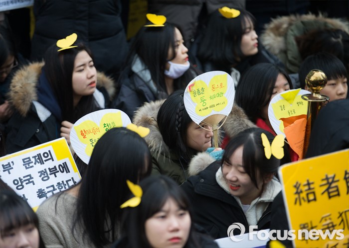 (서울=포커스뉴스) 27일 오후 서울 종로구 구 일본대사관 앞에서 열린 제 1215차 일본군 위안부 문제 해결을 위한 정기수요집회에 참석한 학생들이 머리에 노란 리본을 달고 있다.