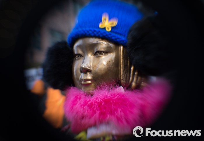 (서울=포커스뉴스) 27일 오후 서울 종로구 구 일본대사관 앞에서 열린 제 1215차 일본군 위안부 문제 해결을 위한 정기수요집회에서 소녀상이 자리를 지키고 있다.