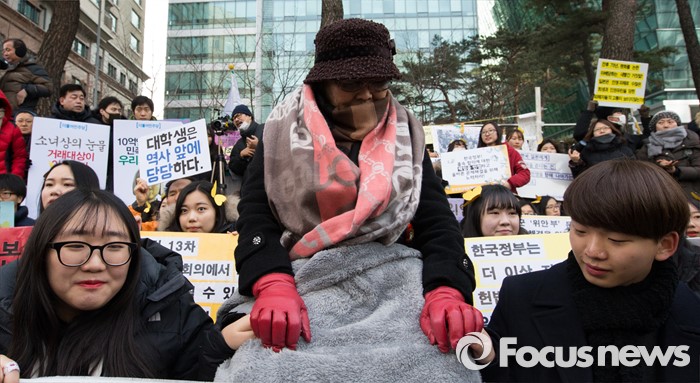 (서울=포커스뉴스) 27일 오후 서울 종로구 구 일본대사관 앞에서 열린 제 1215차 일본군 위안부 문제 해결을 위한 정기수요집회에 참석한 이용수 할머니가 학생들의 손을 잡고 있다.
