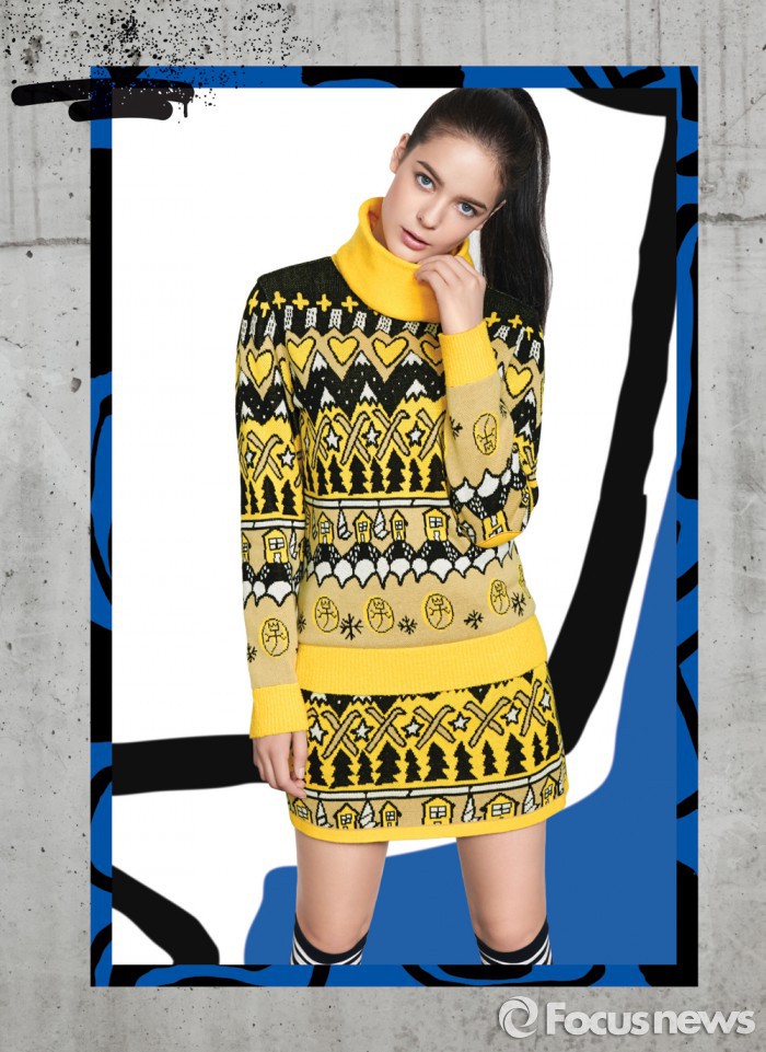 옐로우와 아이보리 두 가지 색상으로 준비됐다. 가격은 풀오버는 23만9000원, 스커트는 15만9000원이다.아트 패턴 방풍 니트 세트의 바람개비 시리즈. <사진제공=까스텔바쟉>