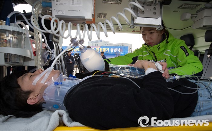 (천안=포커스뉴스) 27일 오후 충남 천안시 단국대학교병원에서 열린 충청남도 응급의료 전용헬기(닥터헬기) 출범식에서 의료진들이 가상 환자이송훈련을 하고 있다.