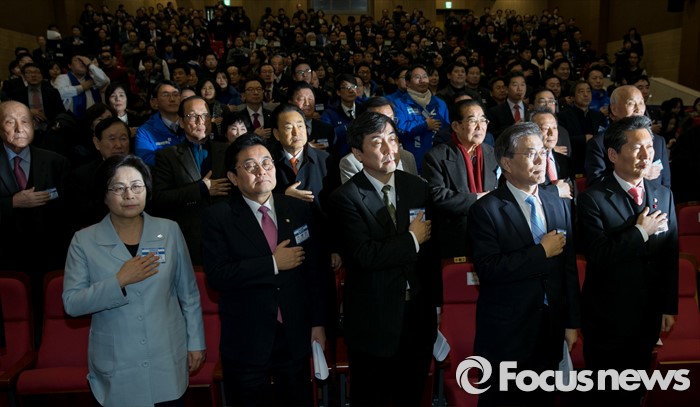 (서울=포커스뉴스) 27일 오후 서울 여의도 국회에서 열린 더불어민주당 중앙위원회의에 참석한 문재인 대표 등 지도부가 국기에 대한 경례를 하고 있다. 앞줄 왼쪽부터 유승희, 전병헌 최고위원, 이종걸 원내대표, 문 대표, 정청래 최고위원.