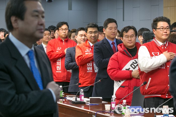 (서울=포커스뉴스) 김무성(왼쪽) 새누리당 대표를 비롯한 청년 예비후보들이 27일 오후 서울 여의도 국회 의원회관에서 열린 새누리당 청년 공천 설명회에 참석해 국민의례를 하고 있다.