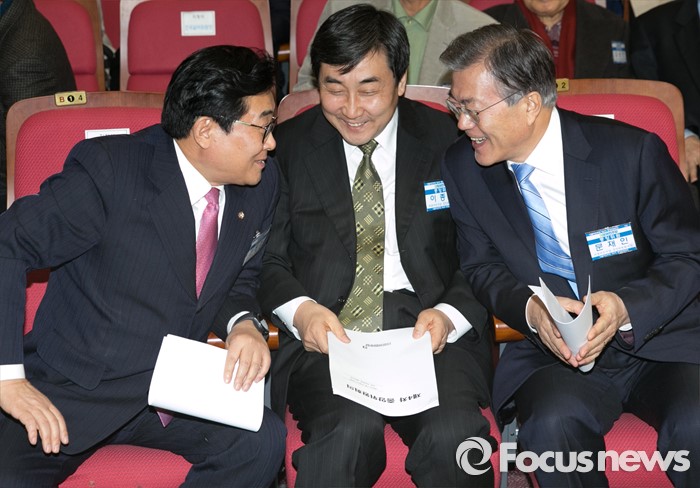 (서울=포커스뉴스) 27일 오후 서울 여의도 국회에서 열린 더불어민주당 중앙위원회의에 참석한 문재인(오른쪽부터) 대표, 이종걸 원내대표, 전병헌 최고위원이 대화하고 있다.