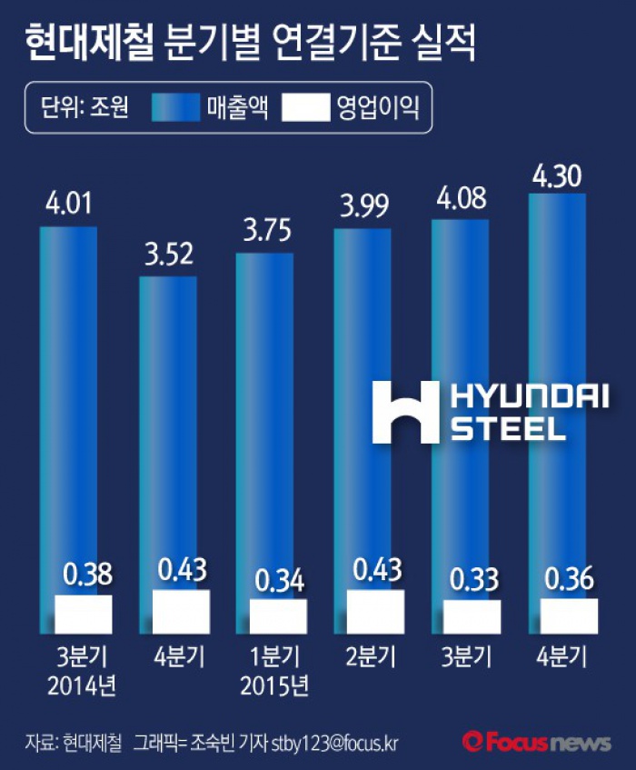 (서울=포커스뉴스) 27일 현대제철은 4분기 연결기준 영업이익이 3602억원으로 전년동기 대비 25.87% 감소했다고 공시했다.
