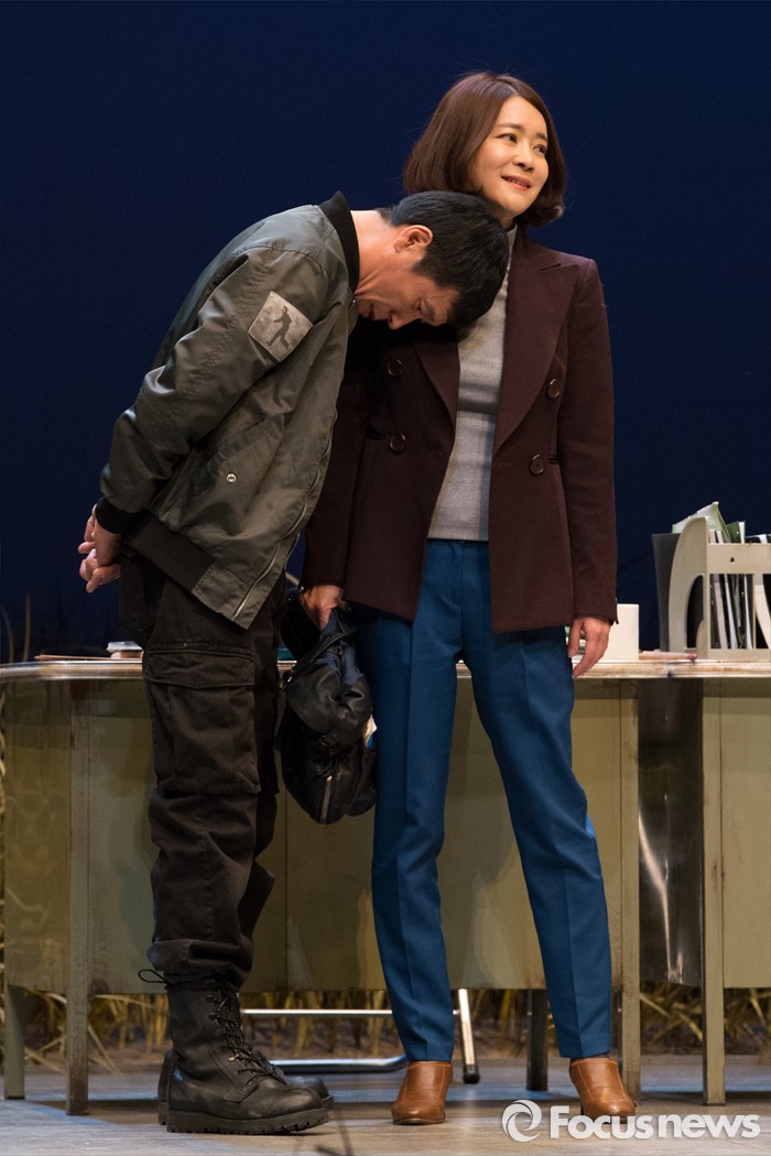 (서울=포커스뉴스) 27일 오전 서울 중구 명동예술극장에서 열린 연극 '날 보러와요' 프레스콜에 배우 김뢰하(조형사)와 이항나(박기자)가 연기하고 있다.