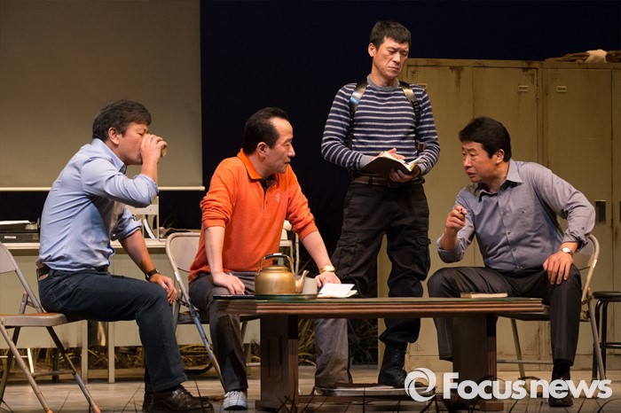 (서울=포커스뉴스) 27일 오전 서울 중구 명동예술극장에서 열린 연극 '날 보러와요' 프레스콜에 배우 권해효(김형사), 유연수(박형사), 김뢰하(조형사), 이대연(김반장)이 연기하고 있다.