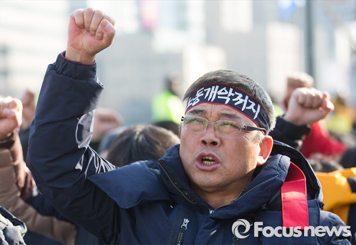 (서울=포커스뉴스) 27일 오후 서울 종로구 세종로 소공원에서 열린 '민주노총 총파업 수도권대회'에 참가한 민주노총 조합원들이 정부의 노동법 개정 중단을 촉구하는 구호를 외치고 있다.