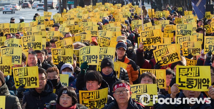 (서울=포커스뉴스) 27일 오후 서울 종로구 세종로 소공원에서 열린 '민주노총 총파업 수도권대회'에 참가한 민주노총 조합원들이 정부의 노동법 개정 중단을 촉구하는 구호를 외치고 있다.