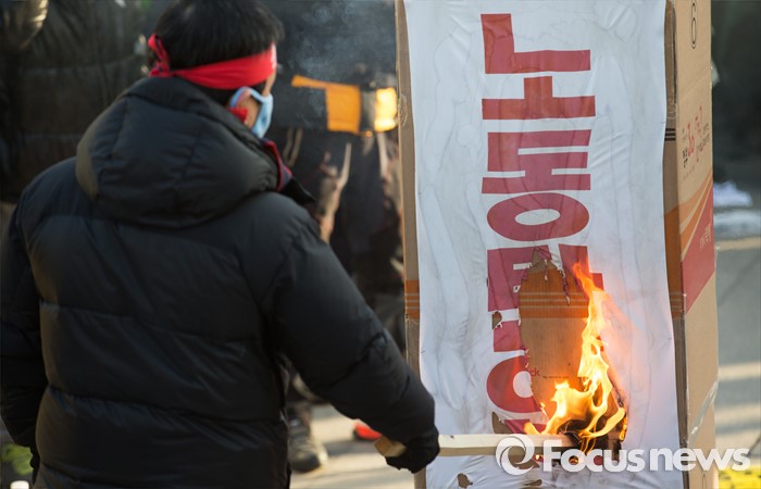 (서울=포커스뉴스) 27일 오후 서울 종로구 세종로 소공원에서 열린 '민주노총 총파업 수도권대회'에 참가한 민주노총 조합원들이 정부의 노동법 개정 중단을 촉구하는 퍼포먼스를 펼치고 있다.