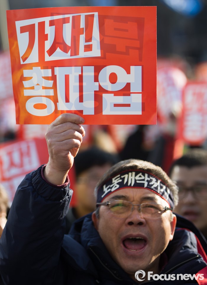 (서울=포커스뉴스) 27일 오후 서울 종로구 세종로 소공원에서 열린 '민주노총 총파업 수도권대회'에 참가한 민주노총 조합원들이 정부의 노동법 개정 중단을 촉구하는 구호를 외치고 있다.