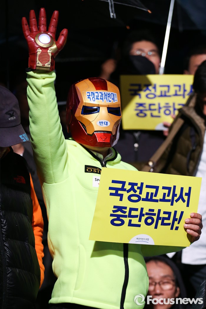 또 “편찬기준 자체는 지금 현재 확정됐지만 공개시점에 대해서는 국사편찬위원회, 편찬심의회 등과 협의 중”이라며 “편찬기준 공개시점은 추후에 다시 말하겠다”고 밝혔다.지난해 11월 6일 오후 서울 종로구 보신각 앞에서 열린 역사교과서 국정화 저지 문화제에서 아이언맨으로 분장한 참석자가 국정교과서 반대 피켓을 들고 있다. 오장환 기자