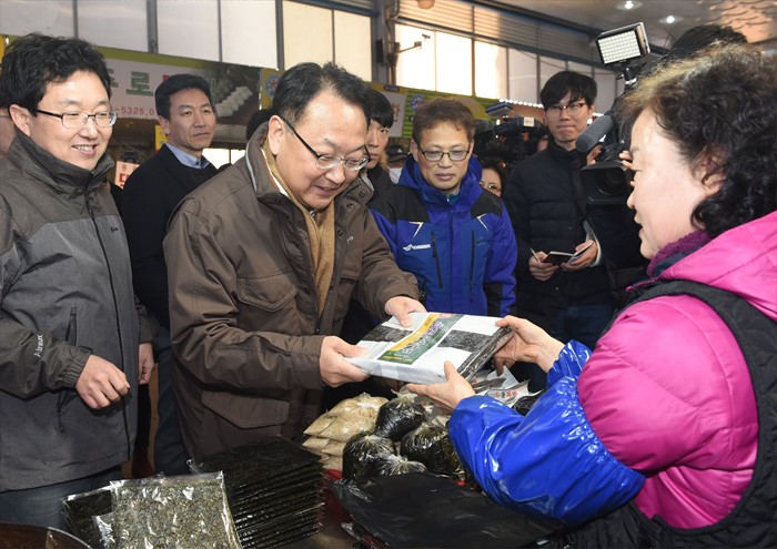 (서울=포커스뉴스) 유일호 부총리 겸 기획재정부 장관이 27일 오후 설 민생대책 후속조치일환으로 설맞이 전통시장 그랜드세일행사를 하고 있는 서울 양천구 신영시장을 방문해 성수품을 구입하고 있다. <사진제공=기획재정부>