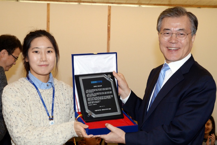 (서울=포커스뉴스) 문재인 더불어민주당 대표가 27일 서울 여의도 한 음식점에서 열린 당직자와의 오찬 간담회에 참석해 당직자들로부터 감사패를 전달받고 있다. <사진제공=더불어민주당>