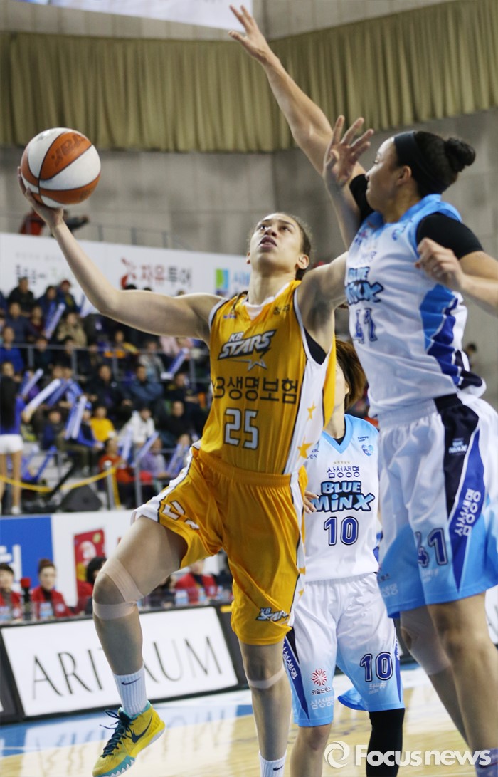 (용인=포커스뉴스) 27일 용인실내체육관에서 열린 2015-2016 여자프로농구 삼성생명-KB스타즈 경기에서 KB스타즈 햄비가 삼성생명 스톡스의 수비를 제치며 레이업슛을 시도하고 있다.