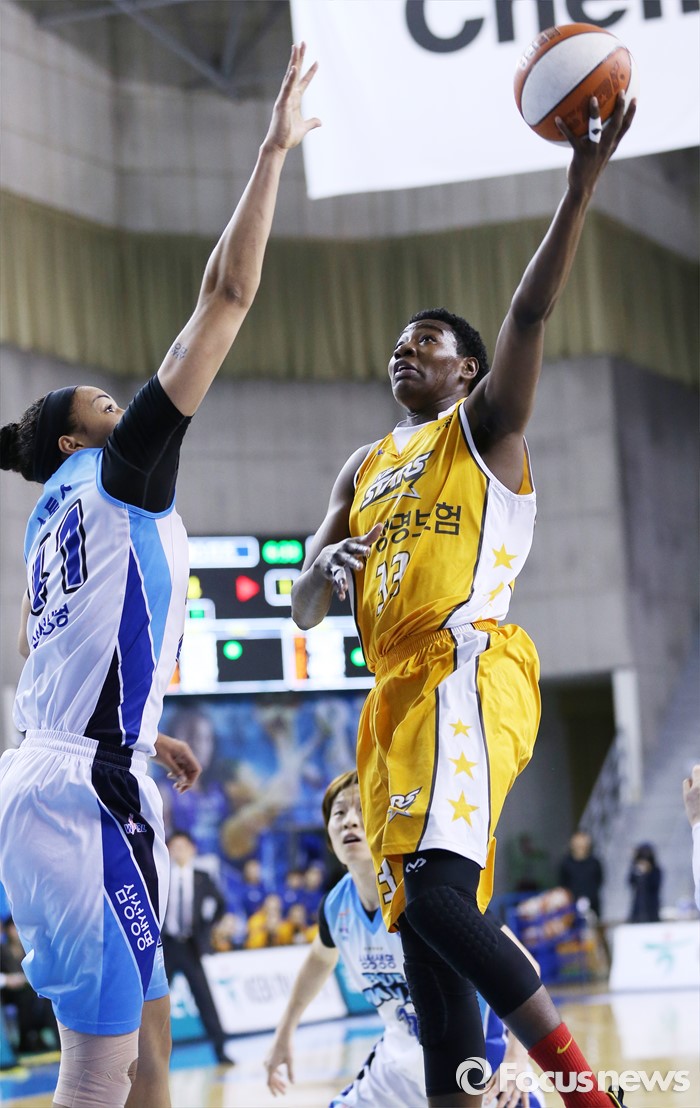 (용인=포커스뉴스) 27일 용인실내체육관에서 열린 2015-2016 여자프로농구 삼성생명-KB스타즈 경기에서 KB스타즈 하워드가 삼성생명 스톡스를 앞에 두고 레이업슛을 시도하고 있다.