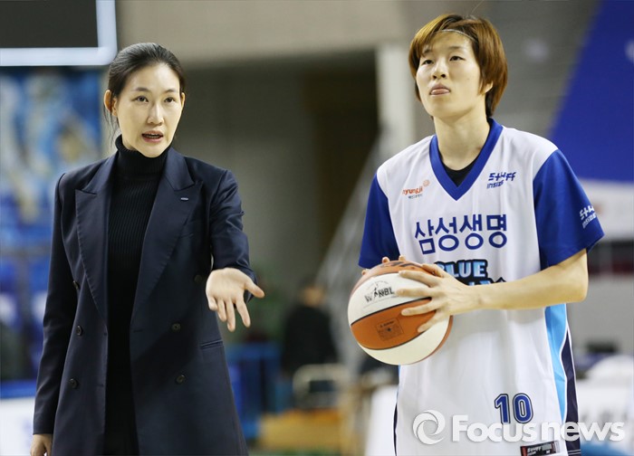 (용인=포커스뉴스) 27일 용인실내체육관에서 열린 2015-2016 여자프로농구 삼성생명-KB스타즈 경기전에 삼성생명 박정은 코치가 고아라의 슈팅폼을 교정해주고 있다.