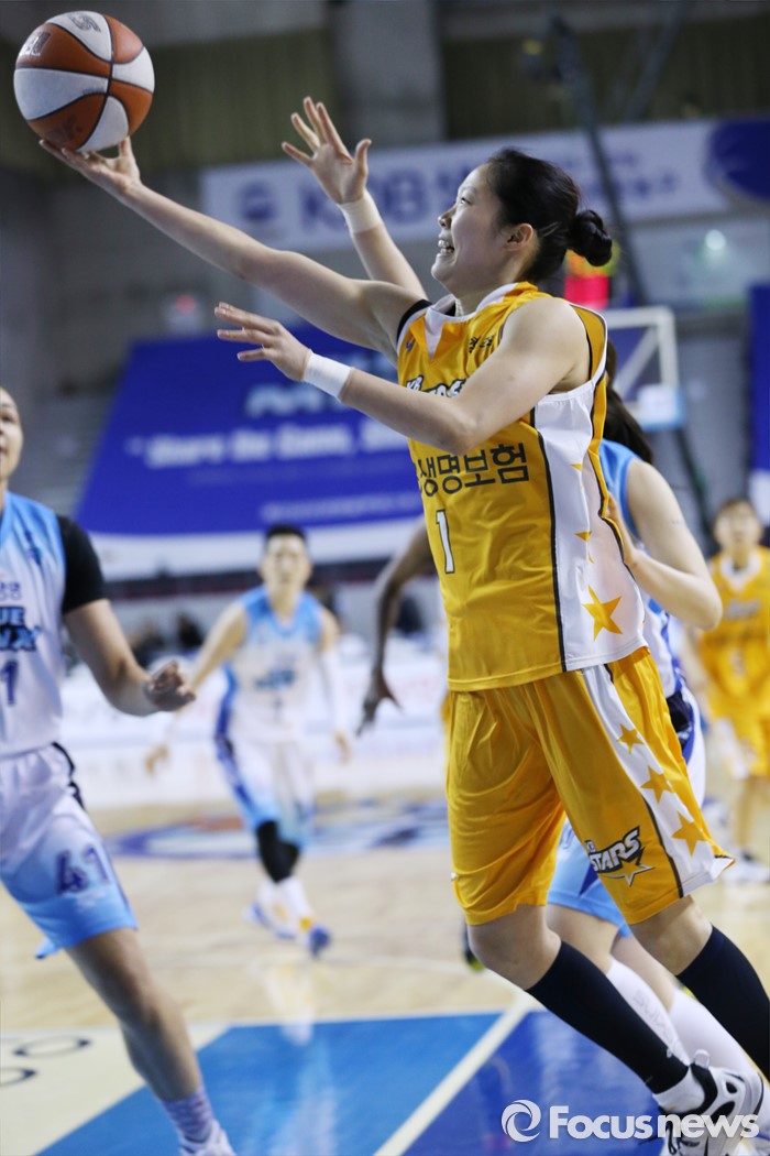 (용인=포커스뉴스) 27일 용인실내체육관에서 열린 2015-2016 여자프로농구 삼성생명-KB스타즈 경기에서 KB스타즈 홍아란이 골밑을 돌파하며 레이업슛을 시도하고 있다.