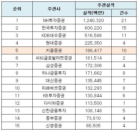 27일 증권업계에 따르면 키움증권은 지난해 IPO 부문에서 주관실적 건수 기준 4위(10건), 실적 기준 5위를 차지했다.