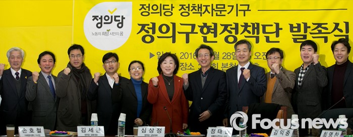 (서울=포커스뉴스) 28일 오전 서울 여의도 국회에서 정의당 정책자문기구 정의구현정책단 발족식에 참석한 심상정 상임대표 등 참석자들이 취재진을 향해 포즈를 취하고 있다.
