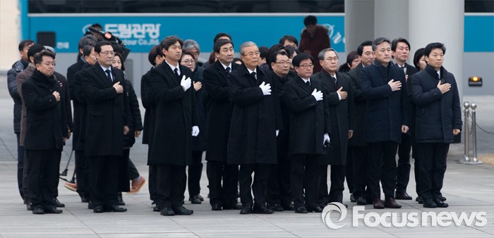 (서울=포커스뉴스) 28일 오전 서울 동작구 국립서울현충원에서 김종인 선거대책위원장 겸 비대위원장이 현충탑 참배에 앞서 국민의례를 하고 있다.